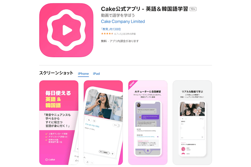 Cakeは、韓国語と英語を動画で学べるアプリです。韓国ドラマや人気アイドルの動画を教材として、リアルな表現を楽しく学べます。