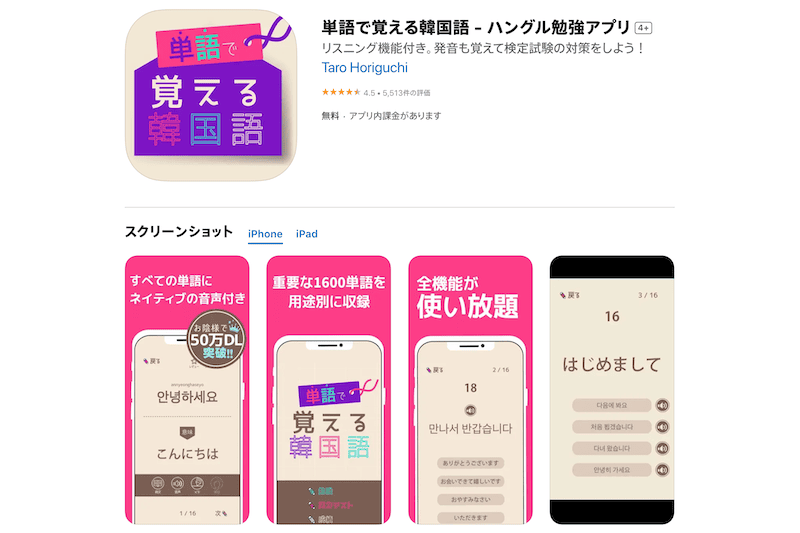 単語にカタカナのルビは振られていないため、ある程度ハングルを覚えてから始めると良いでしょう。課金すると広告を非表示にでき、さらにサクサク進められます。