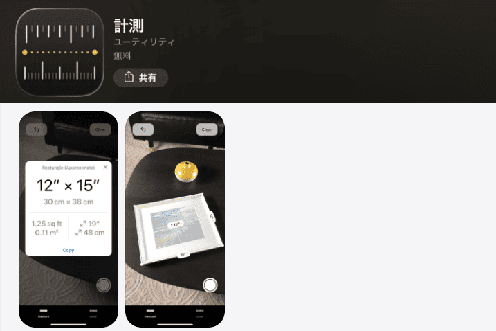 計測は、iPhoneやiPadに標準で搭載されているアプリです。AR(拡張現実)技術を使い、カメラで映したものをリアルタイムに測定できます。ARメジャーとも呼ばれます。
