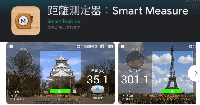 距離測定器:Smart Measureは、離れた場所にある対象物までの距離や、対象物の高さ・幅を測れるアプリです。
