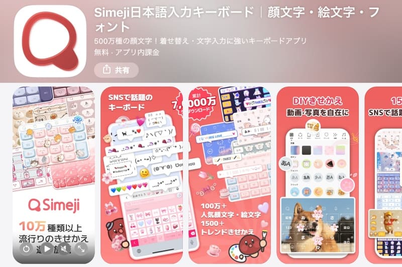 Simejiは、バイドゥ株式会社が提供する日本語入力キーボードアプリです。500万種類以上の顔文字や絵文字が使えるほか、写真や動画をキーボードの背景にできるきせかえ機能が特徴で、若い世代を中心に広く利用されています。変換もストレスがないとの評価が見られます。