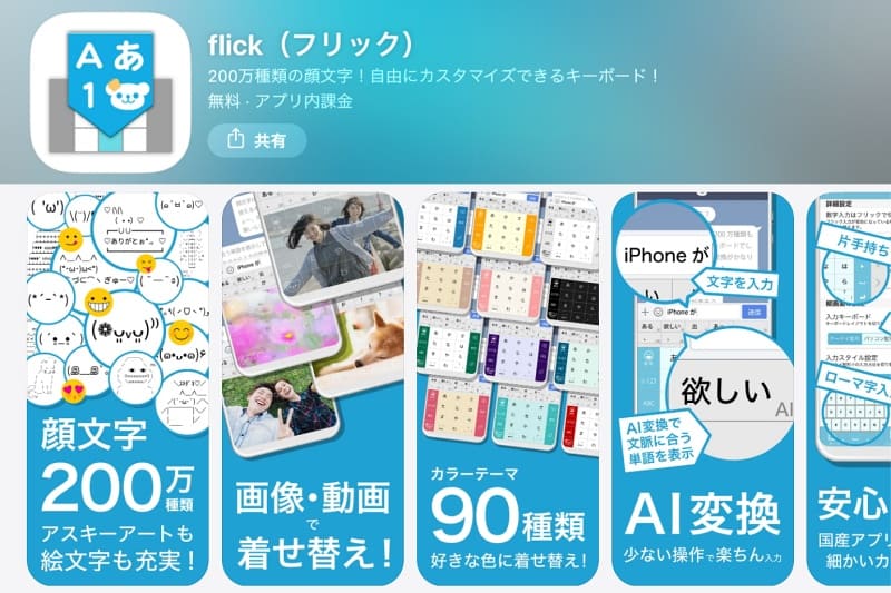 flick(フリック)は、国内企業であるIO株式会社が開発したキーボードアプリです。文脈に合わせた変換を行うAI変換機能を搭載しており、日常会話からビジネス文書まで幅広く活用できます。顔文字・アスキーアートの検索機能や、好みの画像を背景に設定できるきせかえ機能も備えています。