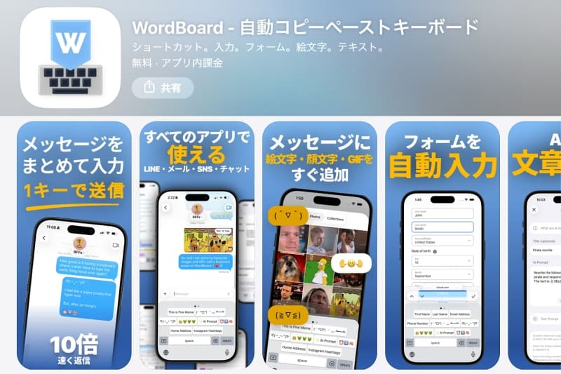 WordBoardは、オーストラリアのBytesize Systems社が提供するキーボードアプリで、定型文を登録したキーを作成できます。辞書登録と異なり、呼び出し用のキーワードを覚えていなくても、単語や定型文をワンタップで呼び出せます。サブキーボードとして重宝するアプリです。