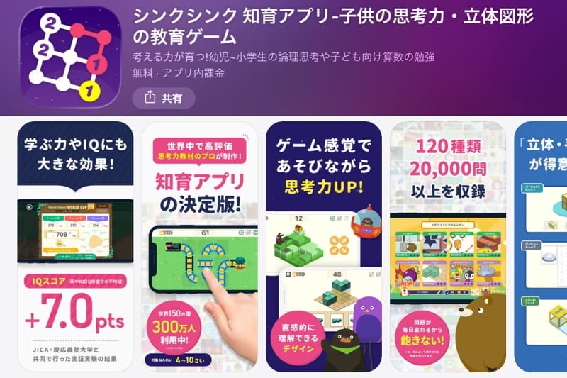 シンクシンクは、幼児から大人まで楽しめる、思考力特化型の知育アプリです。パズルや迷路、図形の問題や空間認識を問うパズルなど、多彩な形式の問題が収録されています。