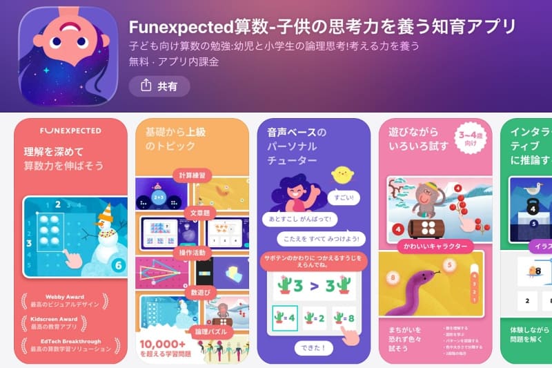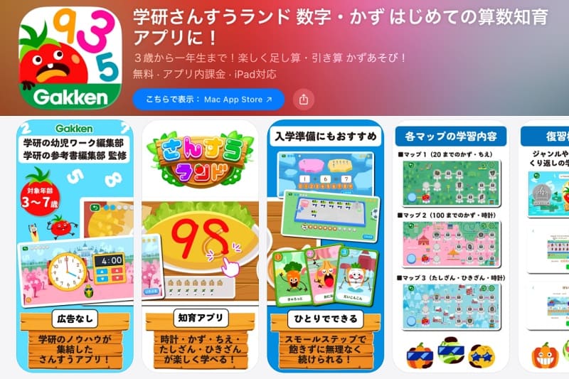 保護者ページもあり、お子さまの進捗を確認できるほか、やりすぎを防ぐためのタイマーも設定できます。お子さまが夢中で遊びながら算数の力を付けられるアプリです。