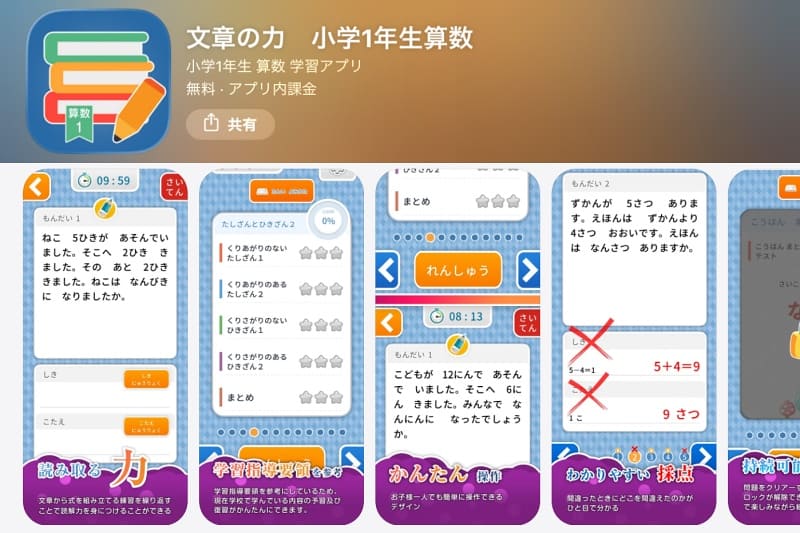 - 内容・特徴:文章問題に特化(足し算、引き算、順番)