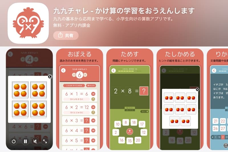 九九チャレは、九九を集中的に学べるアプリです。無料の範囲では、読み方のお手本を聞きながら九九を覚える「まなびコース」と、段ごとに計算問題や虫食い問題、文章問題に挑戦できる「ちょうせんコース」が利用できます。イラストによるヒントも閲覧でき、イメージをつかむのに有用です。