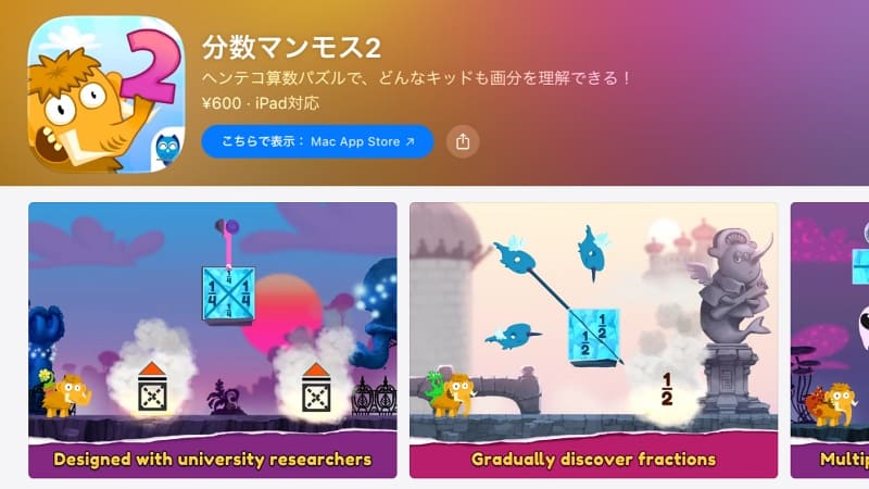 分数マンモス2は、マンモスのキャラクターとともにパズルゲームを進めるなかで、分数の概念を理解できるアプリです。言葉による説明はないのが特徴的で、視覚的・直感的に分数のイメージが身につきます。買い切りの有料アプリで、広告は一切表示されません。