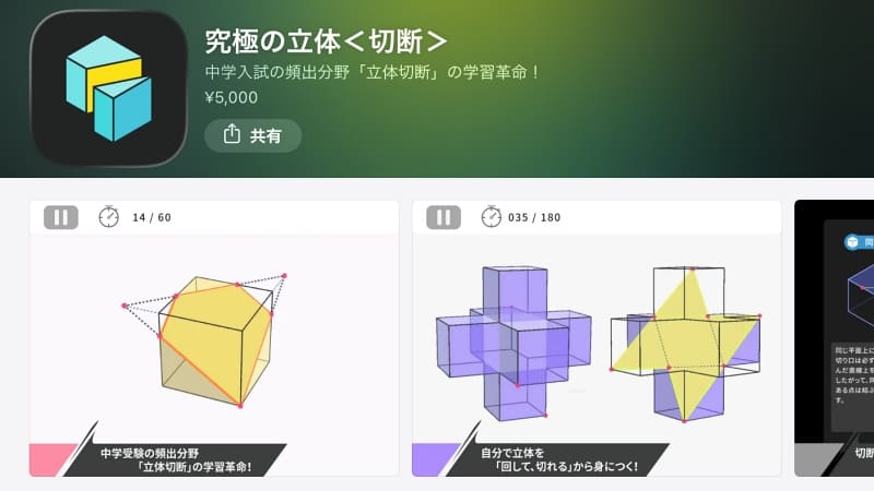 立体図形は、小学4年生以降で本格的に学ぶ分野であり、中学受験においても重要なテーマです。このアプリには、有名校の過去問10年分を分析した厳選100問が収録されており、立体切断の出題パターンを網羅しています。価格は高めですが、中学受験を視野に入れているご家庭には検討の価値があるアプリです。
