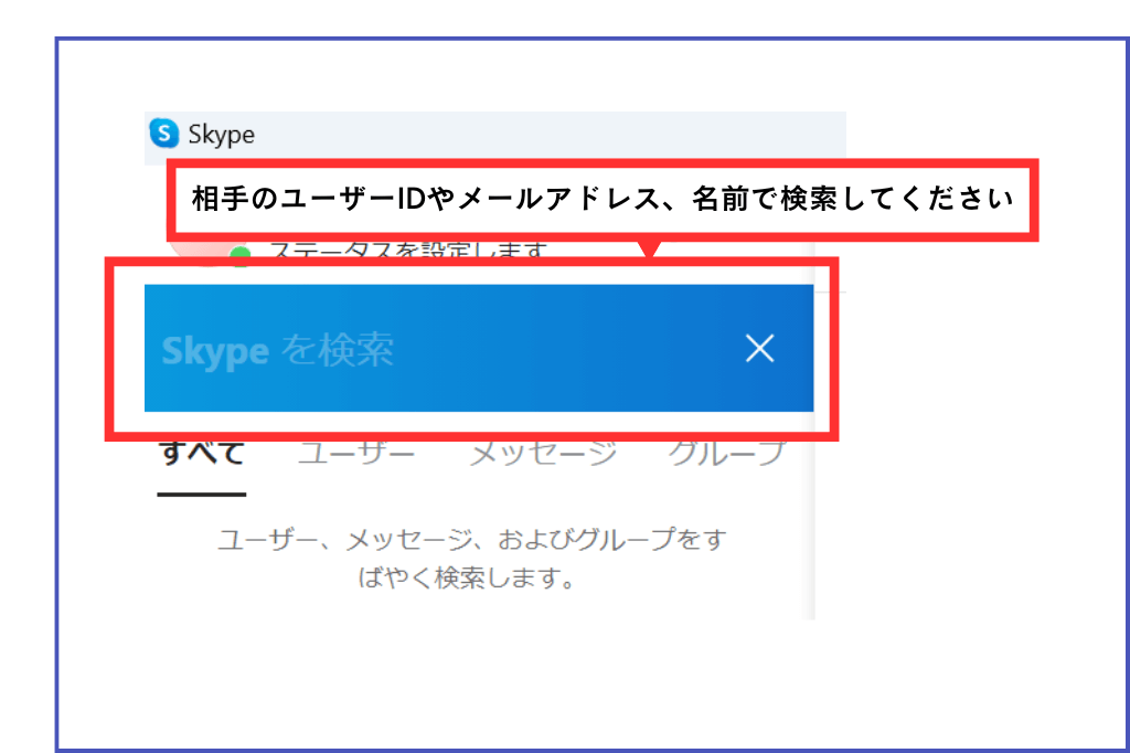 ②検索する相手の名前、Skype名、メールアドレスを入力して検索
