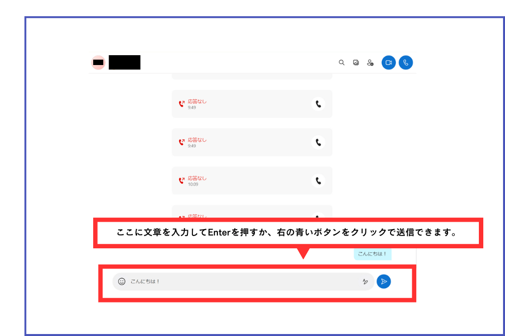 ②画面下のチャットボックスにメッセージを入力し、Enterキーもしくは右横の青いボタン をクリックしてメッセージを送信する