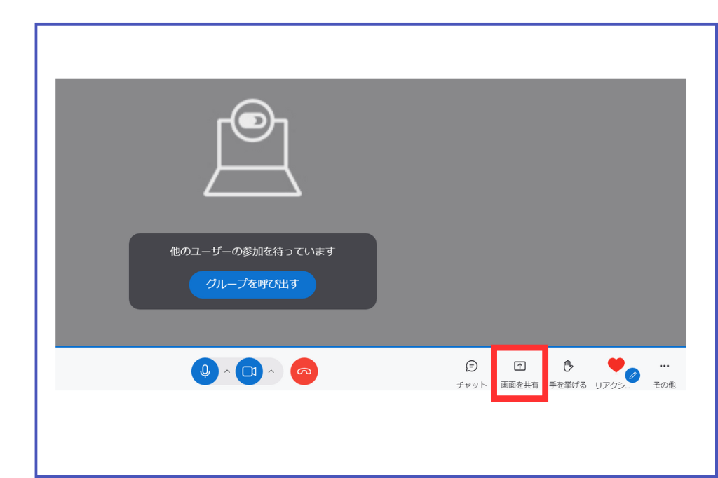 ①ビデオ通話中に画面右下の「画面を共有」をクリック