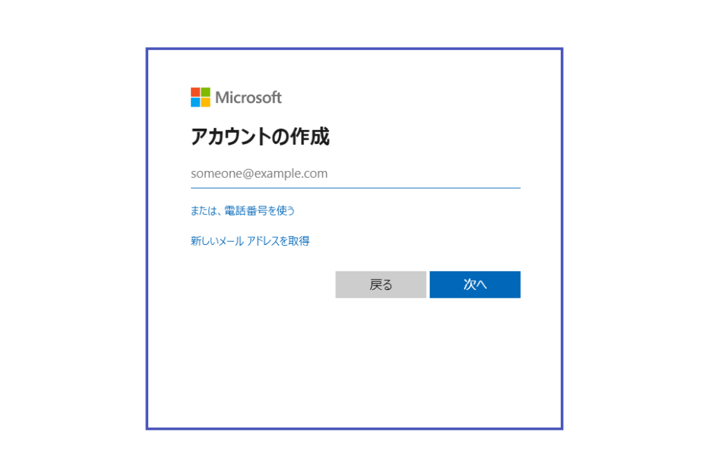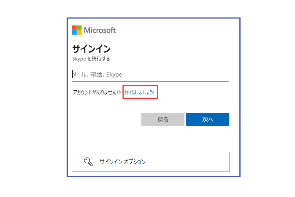 マイクロソフトのアカウントを持っていない場合は「作成しましょう!」からアカウントを作成してください。