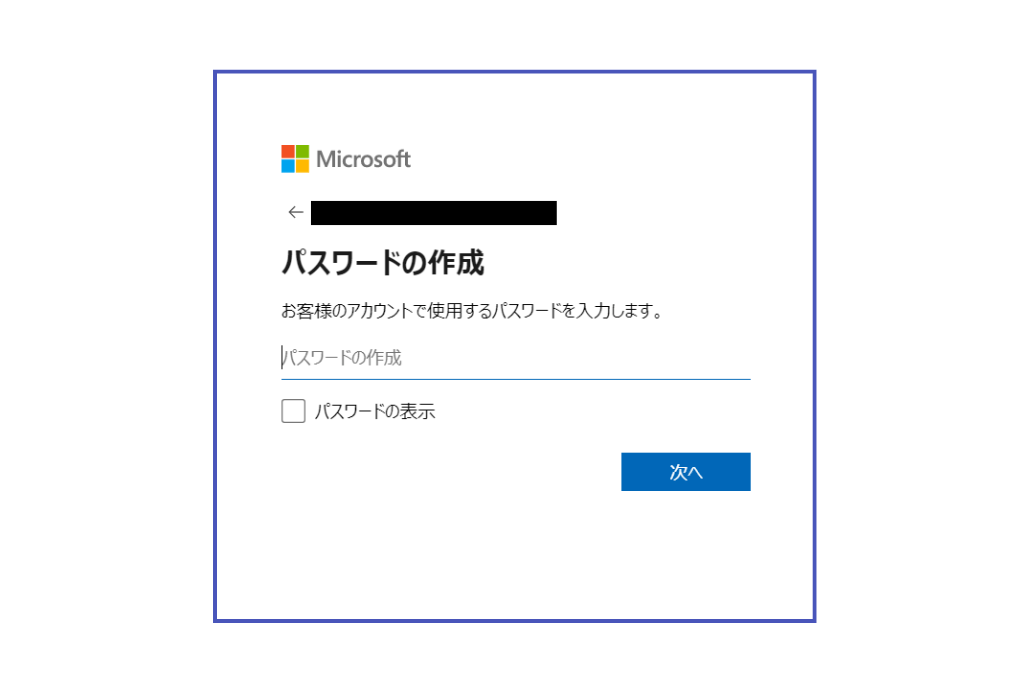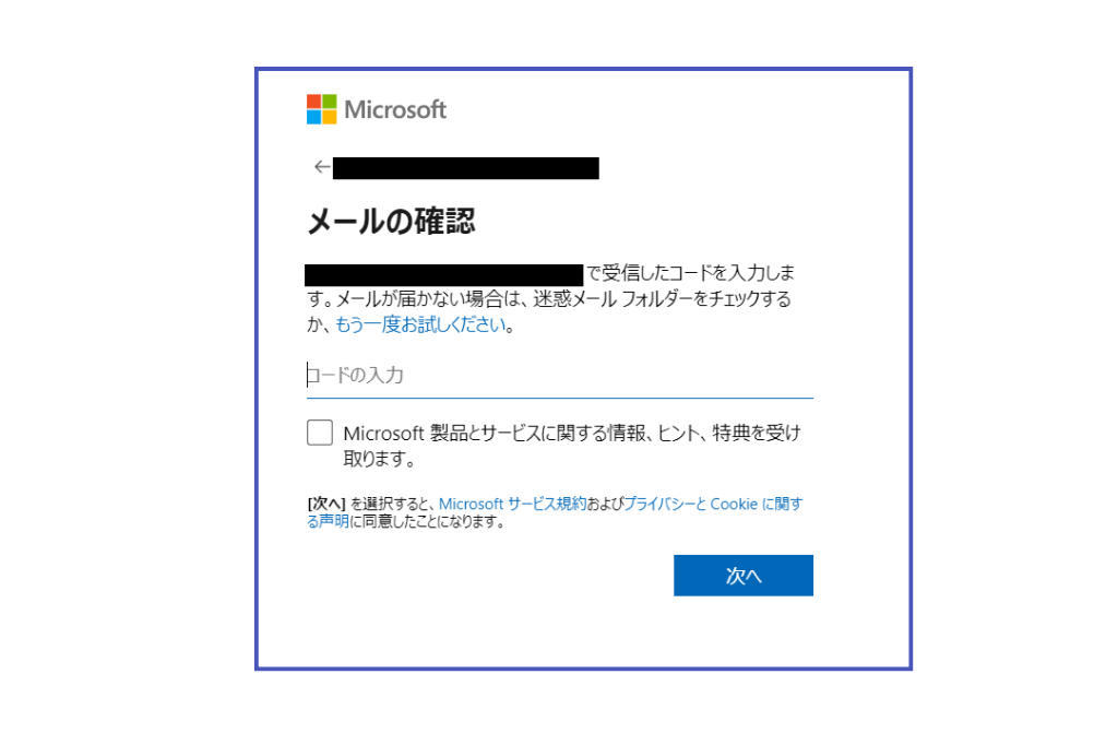 受け取ったコードを画面に入力し、次へをクリックしてください。