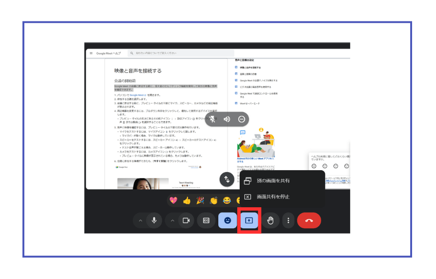画面共有をやめたいときは、上記画像のマークをクリックし「画面共有を停止」を選択します。