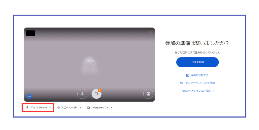Google Meet では、会議に入室する前に、待機スペースでカメラやマイクの状態を確認できます。スムーズな会議進行のためにも、事前に確認しておきましょう。