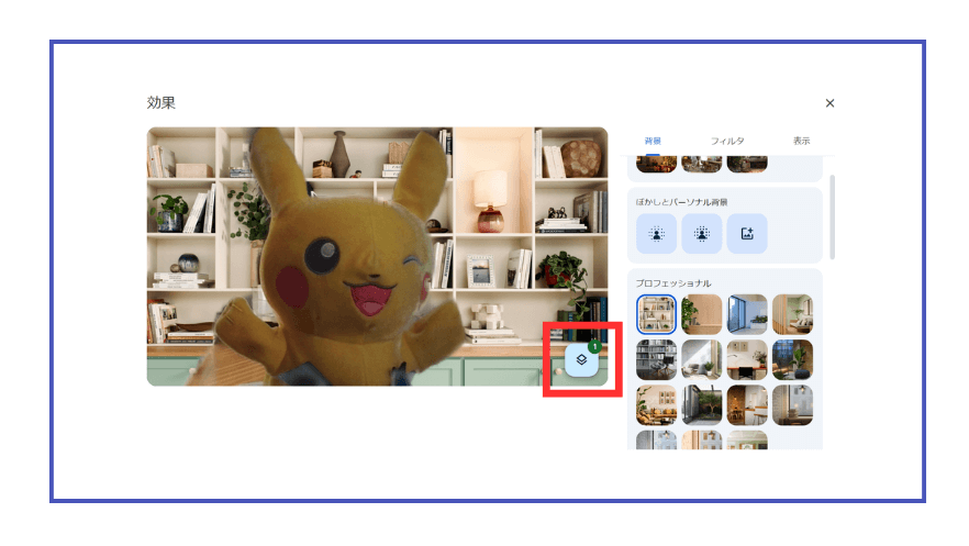 背景をぼかしたり、さまざまな背景に変更したりできます。背景を元に戻したい場合は、画面右下のマークをクリックし「すべて削除」を選択してください。