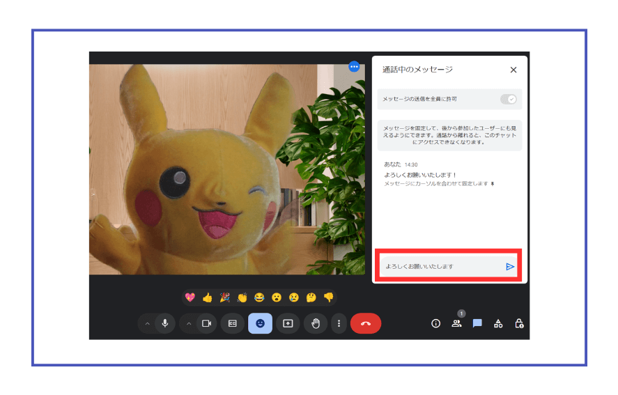 会議の日時と共に会議のリンクを相手に送り、自分もその時間に同じリンクから会議に参加します。
