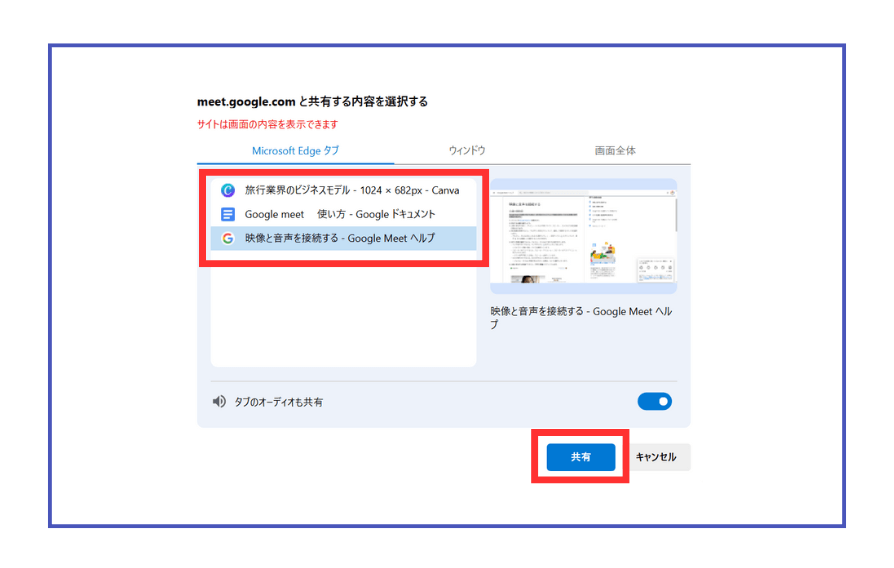 ブラウザで現在開いているページが表示されるため、その中から共有したいものをクリックし、画面右下の「共有」を選択してください。