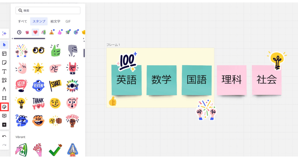 Miroのスタンプと絵文字は、ホワイトボードに活気を与え、感情やフィードバックを視覚的に表現できます。アイデアの視覚化を助け、チーム内コミュニケーションを促進します。検索機能を使えば、利用したい素材を素早く見つけることが可能です。