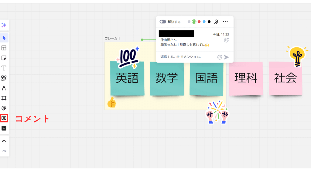 Miroのコメント機能は、ホワイトボード上の任意の場所に直接フィードバックや質問を残せる便利なツールです。