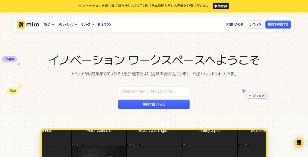 Miroは直感的に操作できるオンラインホワイトボードツールで、チームの共同作業をスムーズに実現します。現在では250万社、8,000万人以上のユーザーに利用されている人気のプラットフォームです。