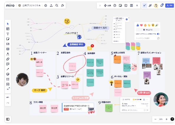 ExcelやGoogleスプレッドシートのデータを付箋形式で取り込めるなど、実用的な機能も豊富に備えています。また、全員が同時に編集できるため、オンラインでも対面のミーティングのような活発な議論ができます。
