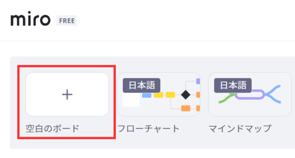 オンラインホワイトボードは、Miroにログインし、画面左上の空白のボードから開けます。