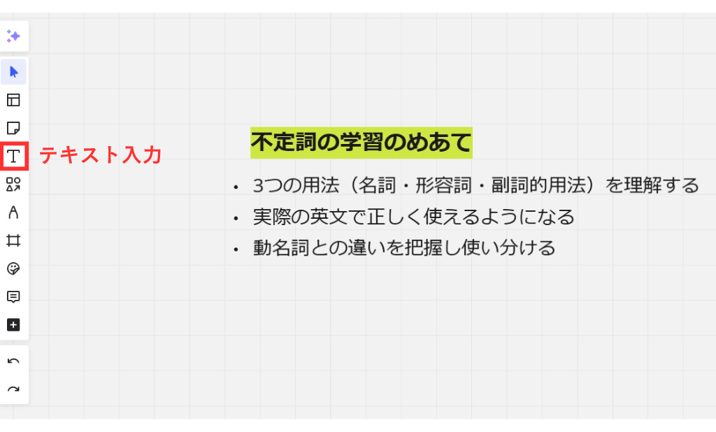 Miroでテキスト入力するときは、画面左の「T」をクリックしてください。入力した文字をクリックすると、フォントのスタイルや配置、リスト、文字色やハイライトなど、さまざまな機能を使用できます。