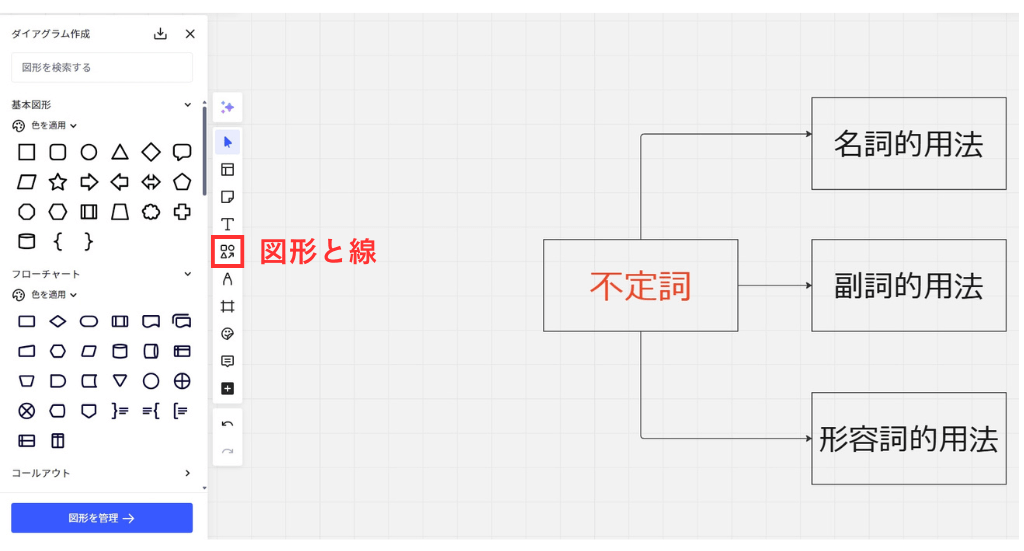 Miroの「図形と線」機能では、丸や四角、吹き出しなどをドラッグ&ドロップで配置可能です。図や情報の関係を示す線も入力でき、フローチャートやプロセス図を簡単に作成できます。