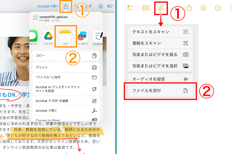 PDFをメモアプリに貼り付ける方法は、以下の2つです。