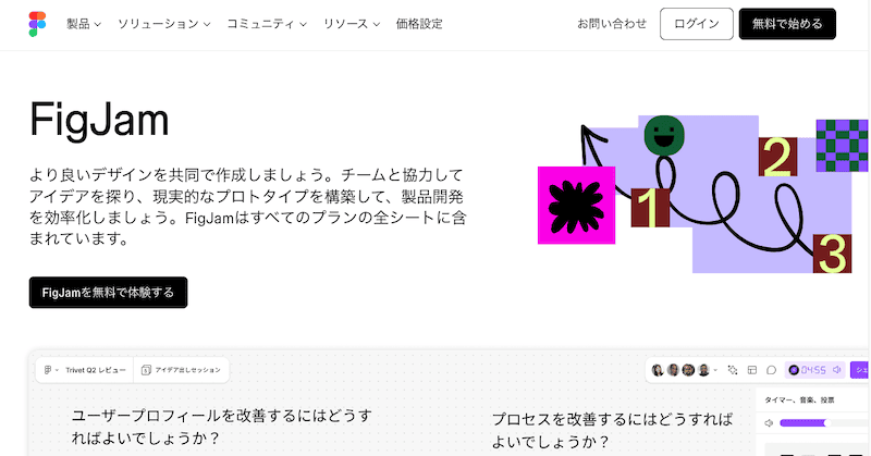 FigJam(フィグジャム)は、プロ向けのデザインツールも手がけるFigma(フィグマ)が作ったオンラインホワイトボードツールです。(Figma社のプロ向けツール自体もFigmaと呼ばれます)
