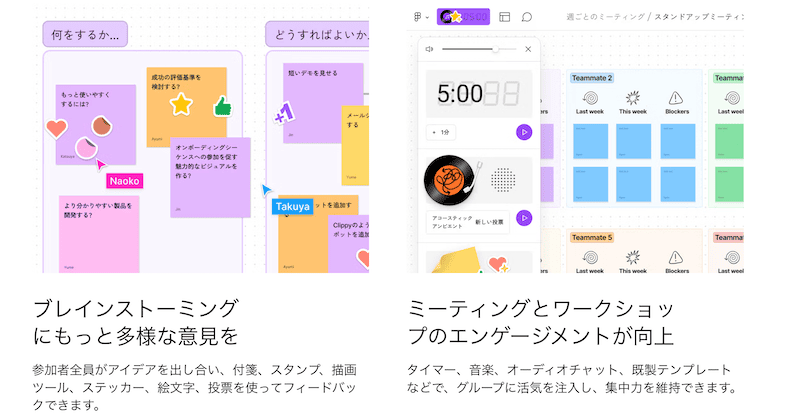 FigJamはビジネスの場でも活用されています。ミーティングやブレインストーミングでは、物理的なホワイトボードと同じように付箋や書き込みでアイデアを出し合い、視覚的に整理可能です。スタンプやテキストチャットといったリアルタイムのコミュニケーション機能も充実しているため、オンラインでも活発にやりとりできるでしょう。