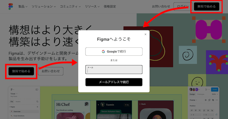 FigJamを利用するには、Figmaアカウントが必要です。Figmaのサイトのいろいろな場所に「無料で始める」ボタンがあるので、クリックしてアカウントを作りましょう。Googleアカウントとの連携が便利です。