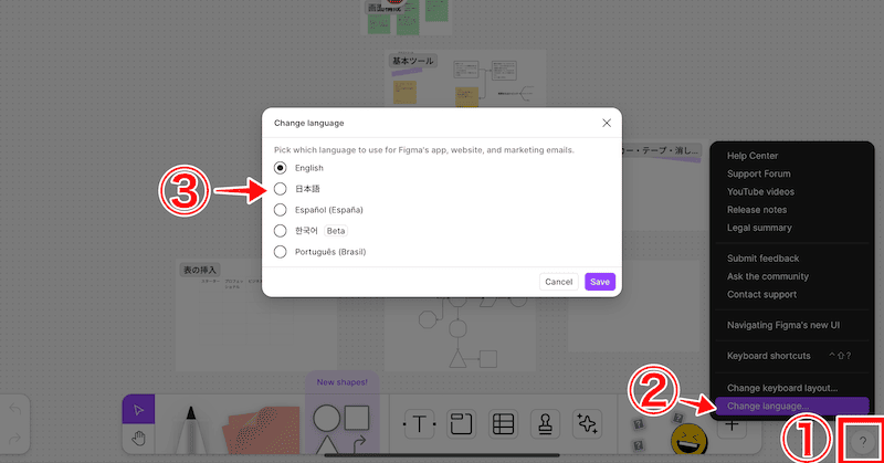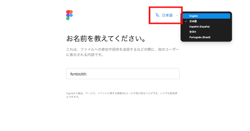 FigJamのデフォルト言語は英語のため、日本語への切り替え操作が必要な場合があります。アカウントの作成途中で言語ボタンが出ていれば、切り替えてしまいましょう。