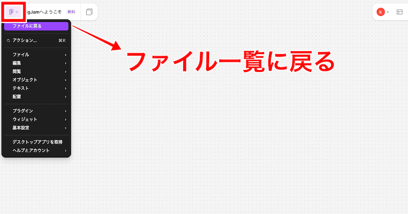 なお、FigJamのページからアカウント登録をした場合は、すぐに新規のホワイトボード画面になるかもしれません。ここから別のホワイトボードを作るには、左上のメニューを開いて「ファイルに戻る」をクリックし、ファイル一覧の画面に切り替えましょう。