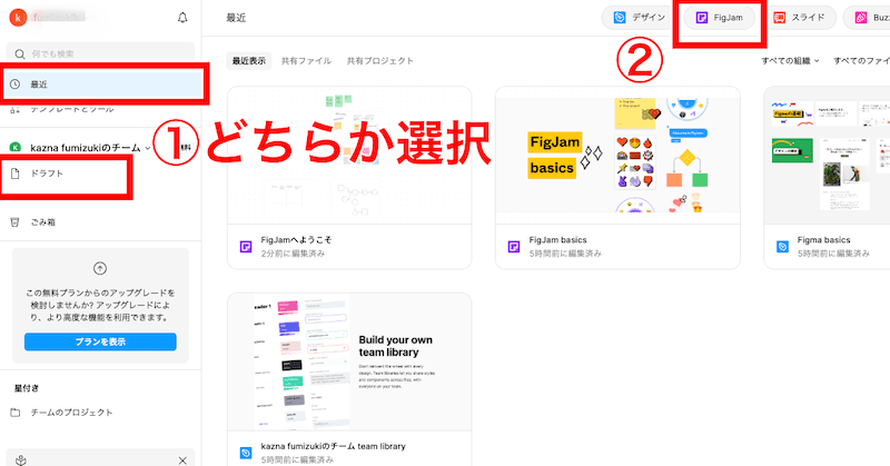 そして右上メニューから「FigJam」をクリックすると、新しいホワイトボードファイルが作れます。(右上に「+作成」ボタンが表示されている場合は、これをクリックして「FigJam」を選択します)