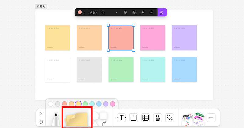 テキスト装飾の選択肢は、付箋や図形などに文字を入力するときも、基本的に同じです。