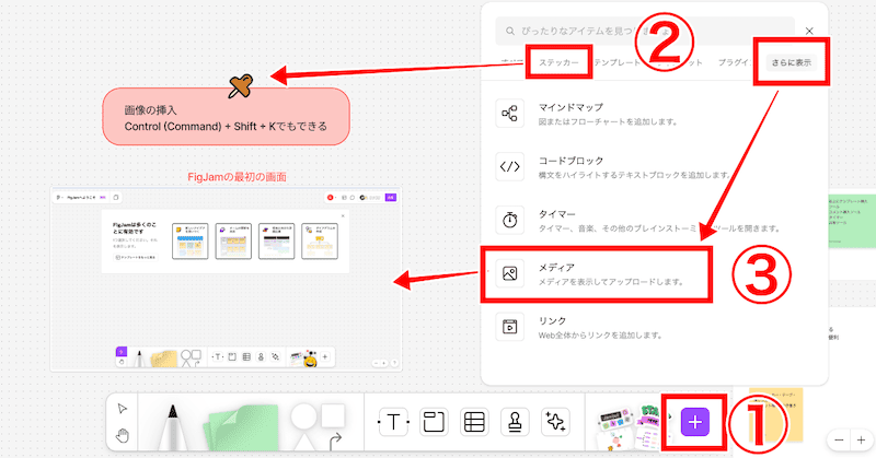 端末に保存されている画像をボードに貼ることができます。また、FigJamにステッカーとして登録されている画像を、繰り返し貼ることもできます。どちらもツールバーの右端の「+」から操作します。