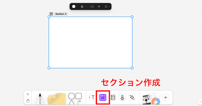 セクション機能を使うと、要素をまとめて見やすくできます。画面下部のツールバーから新しく作れるほか、配置済みの要素を複数選択してセクション化することも可能です。
