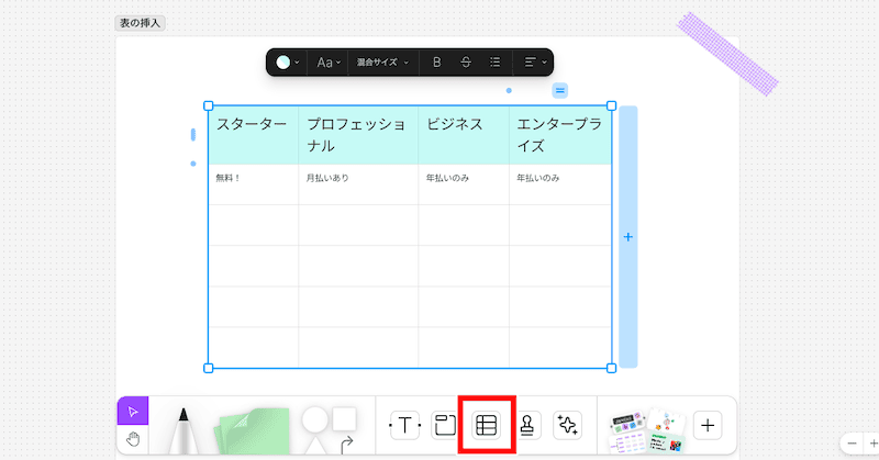 表もツールバーから作成できます。列・行の追加や順番の入れ替え、背景色の変更、文字のサイズや配置の変更も可能です。