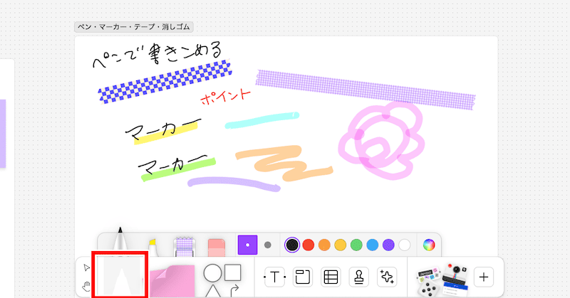 ツールバーのペンマークをクリックすると、ペン、マーカー、マスキングテープ、消しゴムが選択できます。iPadなどのタブレット端末で手書きする際に便利な機能です。マスキングテープはマウスやトラックパッドでも引きやすいです。
