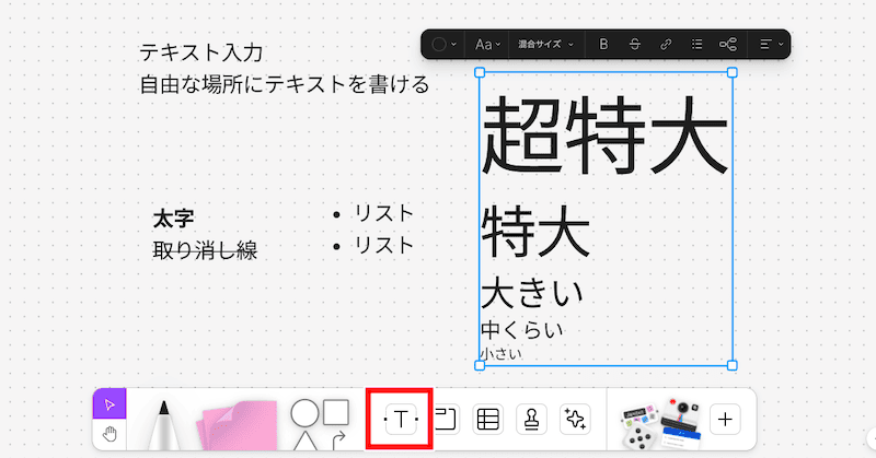 ホワイトボード上の自由な位置にテキストを入力できます。文字の大きさは5段階から選ぶことも、数値で指定することもできます。太字や取り消し線、リストといった書式設定も可能です。