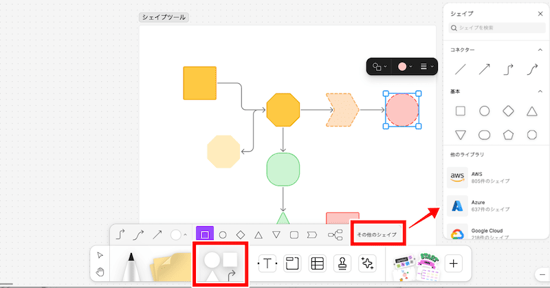 コネクターを使うと、図形や付箋をつないで関連性を見やすくできます。コネクターの入力は、図形の各辺にカーソルを合わせると現れる「→」をクリックしても可能で、スピーディーに図形をつないでいけます。