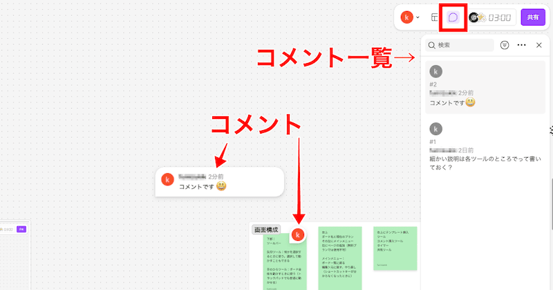 ボード上の特定の箇所にコメントを残せる機能です。ボードの書き込みを乱さずに、気になる点をメモしたり、共同編集者をメンションして伝えたりできます。右上のコメントアイコンから利用可能です。