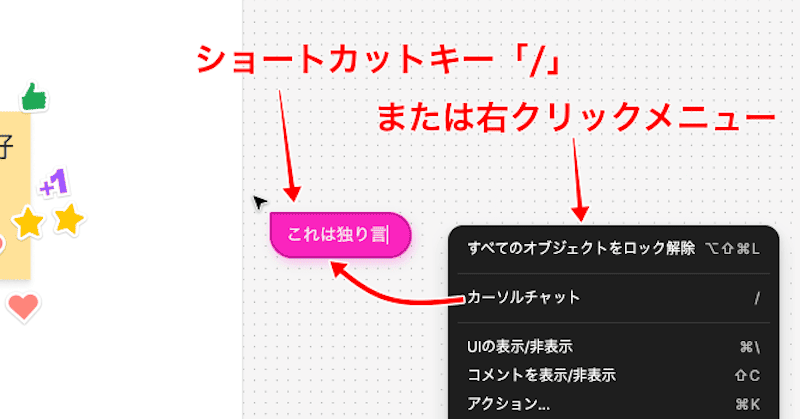 自分のカーソルの位置に吹き出しを表示し、一時的なチャットを行う機能です。コメントに残すほどではない簡単なコミュニケーションを、リアルタイムで行えます。入力後一定の時間がたつと、自然に消えていきます。
