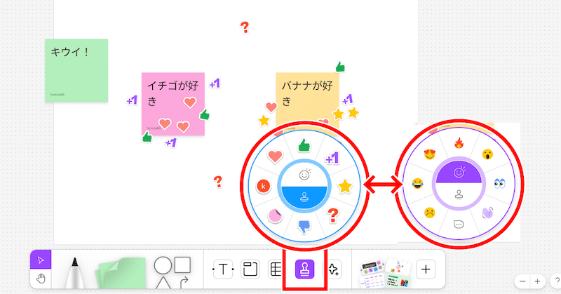 共同編集で気軽な意思表示に使えるのが、スタンプや絵文字です。スタンプは押した場所に残るため、どの意見を支持するか印を付けたり、書き出した作業の分担を決めたりする際に便利です。