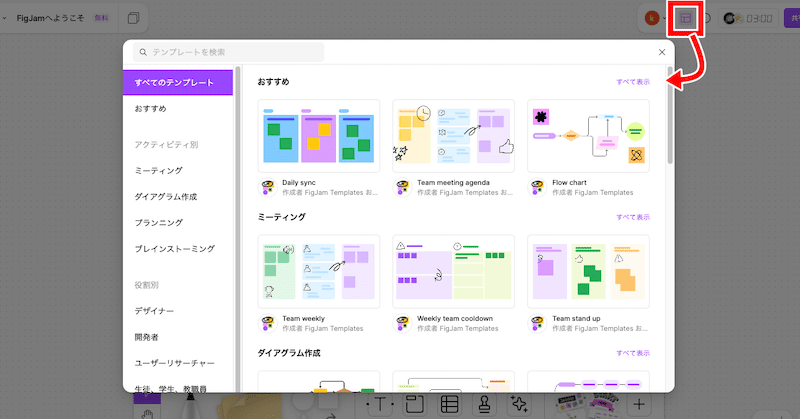 テンプレートは画面右上のメニューから選択できます。ミーティング用、プランニング用といった用途別や、デザイナー向け、生徒・教職員向けといった役割別から探すことができます。