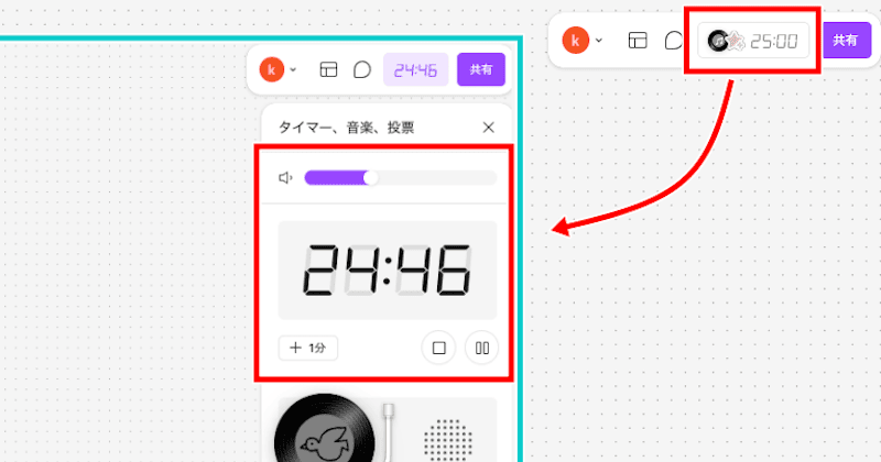 タイマーは画面右上のメニューから設定できます。集中して作業する時間を設定したり、ブレインストーミングの制限時間を設けたりと、時間を効率的に使えます。