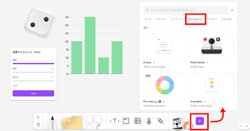 ウィジェットとは、特定の機能を持ったカードのようなものです。ToDoリストやグラフを簡単に挿入できるウィジェット、投票ウィジェット、画面上でサイコロを振れるウィジェット、カメラと連動して写真を撮れるウィジェットまで、多彩な種類がそろっています。情報整理やミーティングに活用してください。